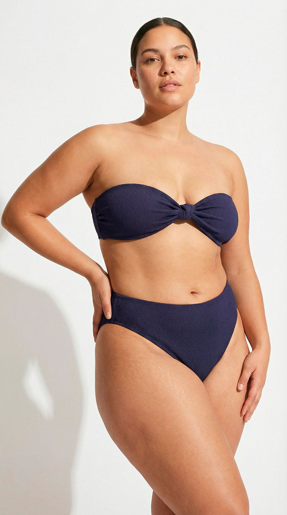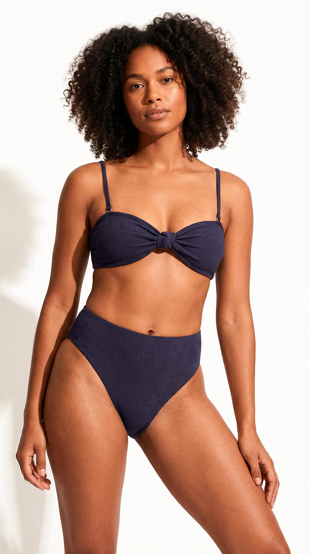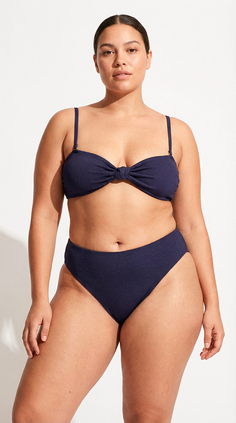 Our Sacha bikini bandeau in navy is crafted from soft, recycled polyester with a beautiful textured finish and an elegant knot at the center. With removable straps for added versatility, it offers the perfect fit whether you're lounging or taking a swim. Complete the set with our matching Sacha bikini briefs or Sacha bikini tanga for a beautiful beach look.