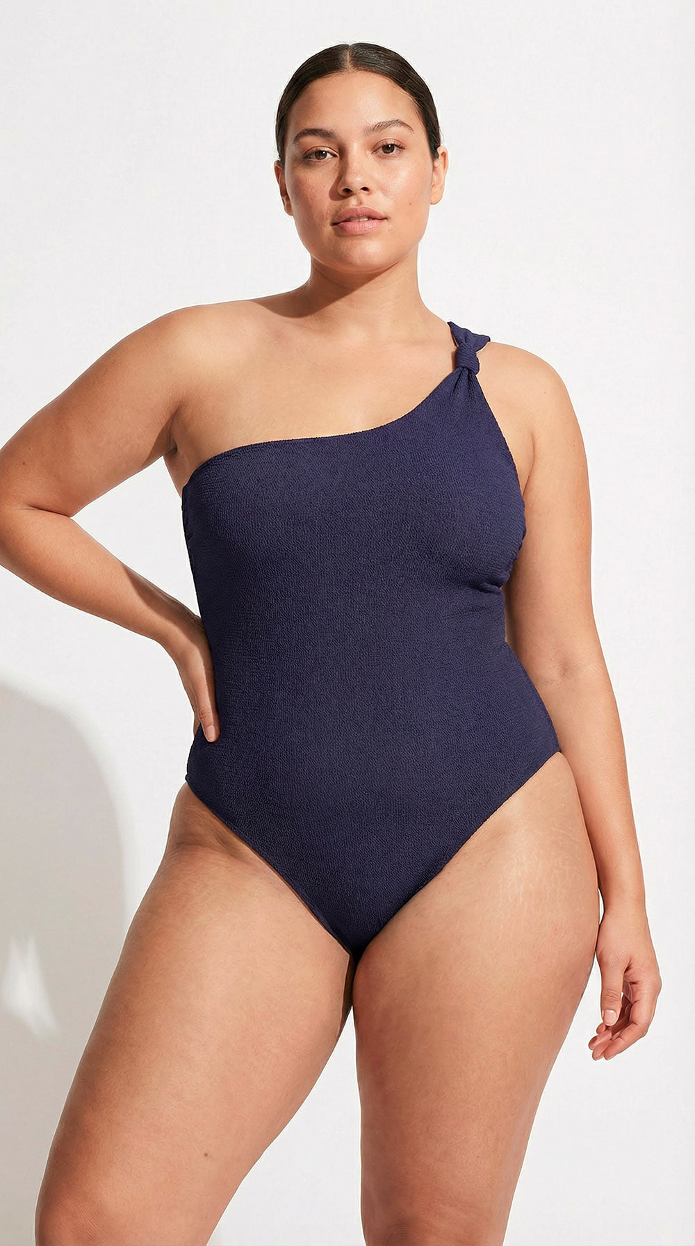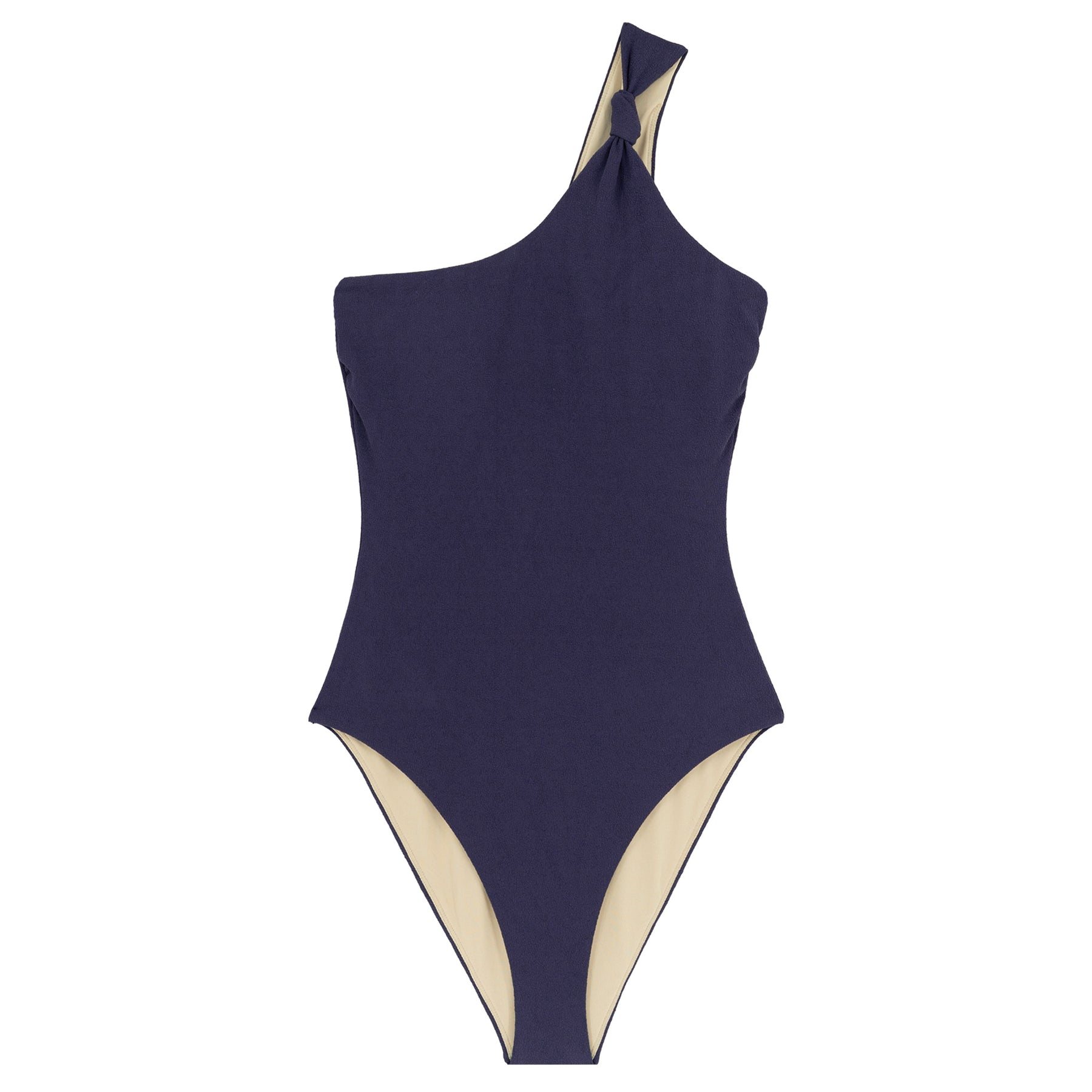 Our Sacha Swimsuit in navy is crafted from soft, recycled polyester with a beautiful textured finish. The one-shoulder design features a stylish knot detail and a high-cut leg, creating an effortless and elegant poolside look.